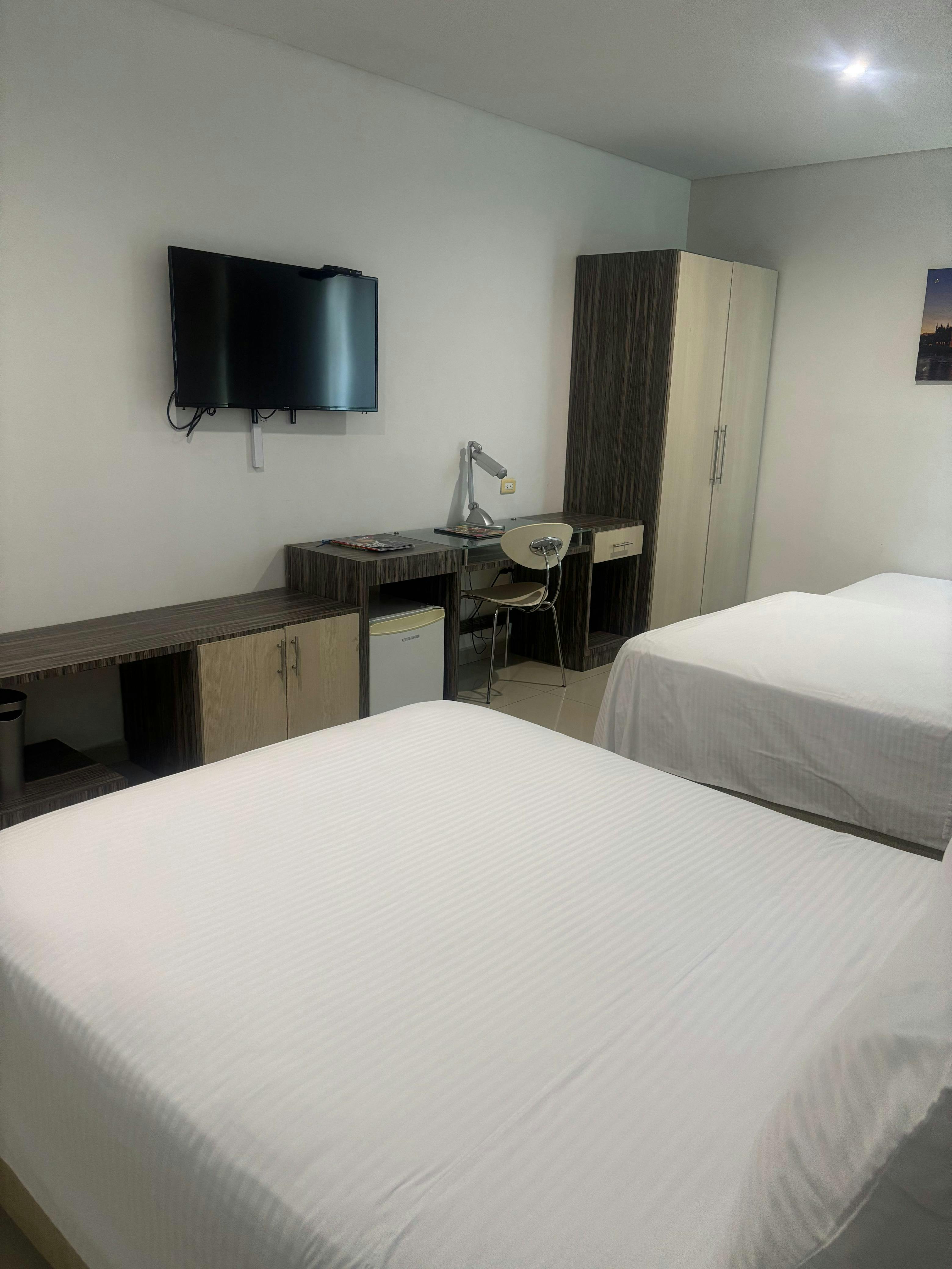 Ideal para familias o grupos de hasta 5 personas, nuestra Suite Triple Deluxe ofrece una experiencia de alojamiento cómoda, amplia y funcional en un ambiente moderno y acogedor. Con una excelente distribución, esta habitación tipo suite cuenta con dos camas dobles y una cama sencilla, garantizando el descanso de todos los huéspedes.